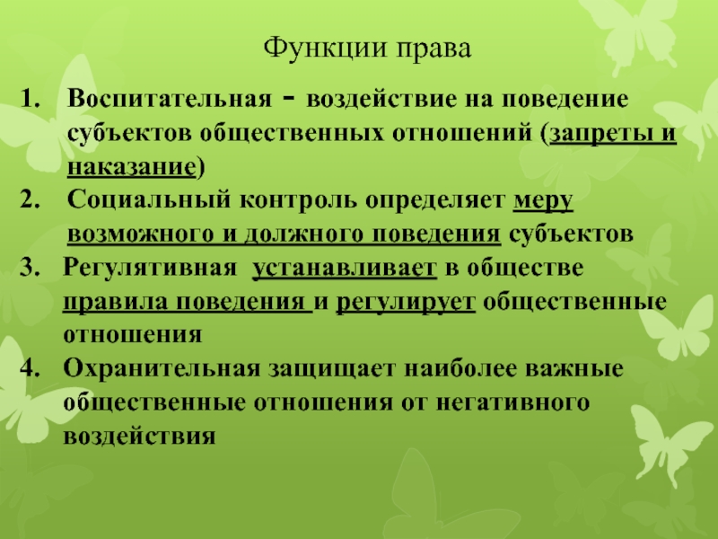 Воспитательная - воздействие на поведение субъектов общественных отношений (запреты