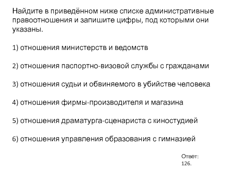 Слайд 82Найдите в приведённом ниже списке административные правоотношения и запишите цифры,