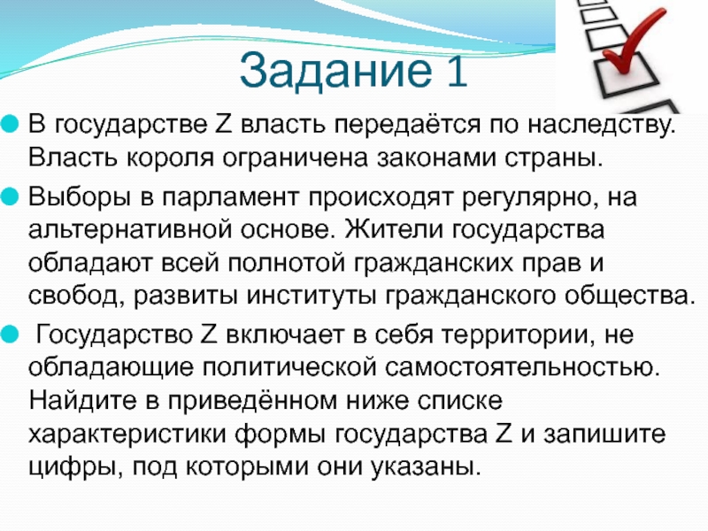 альтернативной основе. Жители государства обладают всей полнотой гражданских прав и свобод, развиты институты гражданского общества.Государство Z включает в себя территории, не обладающие политической самостоятельностью. Найдите в приведённом ниже списке характеристики формы государства Z и запишите цифры, под которыми они указаны.