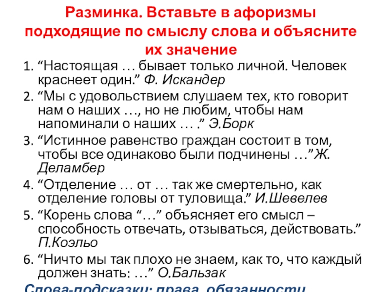 Слова-подсказки: права, обязанности, ответственность, закон.