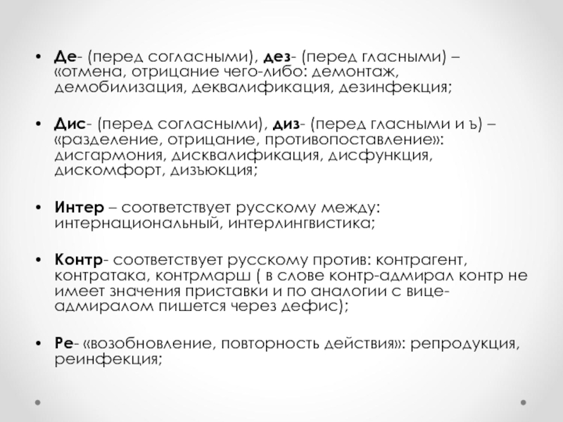 Слайд 14Де- (перед согласными), дез- (перед гласными) – «отмена, отрицание чего-либо: