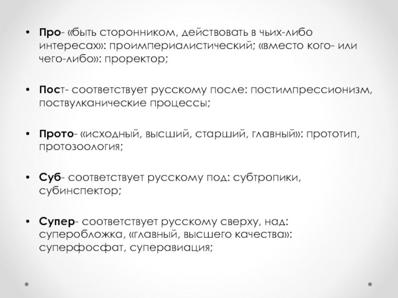Слайд 15Про- «быть сторонником, действовать в чьих-либо интересах»: проимпериалистический; «вместо кого-