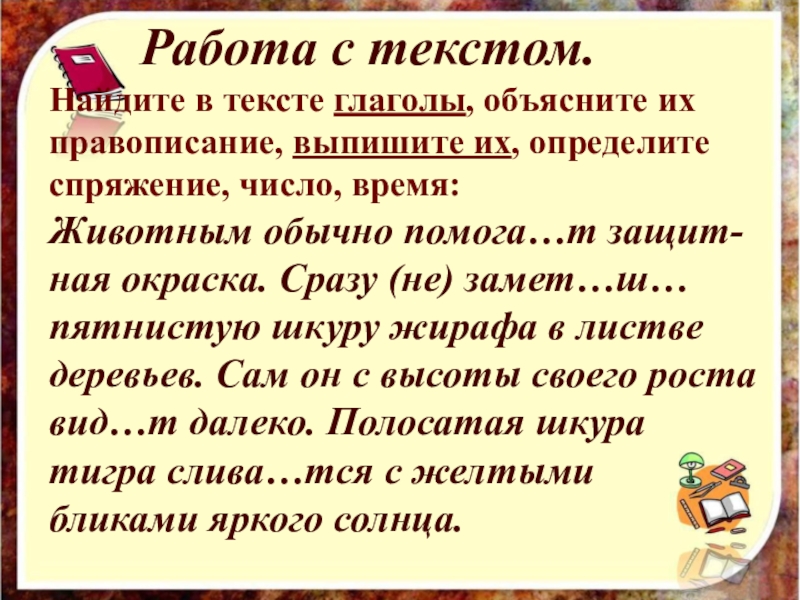 (не) замет…ш… пятнистую шкуру жирафа в листве деревьев. Сам он с высоты своего роставид…т далеко. Полосатая шкура