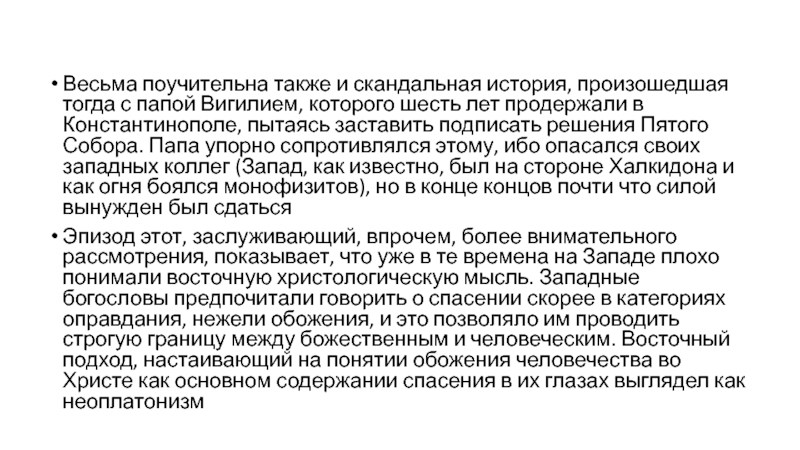 Эпизод этот, заслуживающий, впрочем, более внимательного рассмотрения, показывает, что уже в те времена на Западе плохо понимали восточную христологическую мысль. Западные богословы предпочитали говорить о спасении скорее в категориях оправдания, нежели обожения, и это позволяло им проводить строгую границу между божественным и человеческим. Восточный подход, настаивающий на понятии обожения человечества во Христе как основном содержании спасения в их глазах выглядел как неоплатонизм