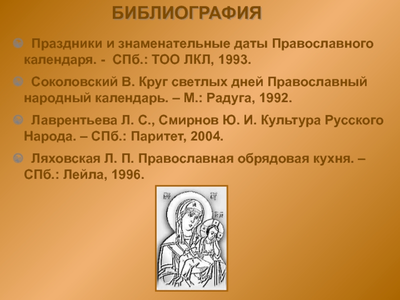 Ляховская Л. П. Православная обрядовая кухня. – СПб.: Лейла, 1996.