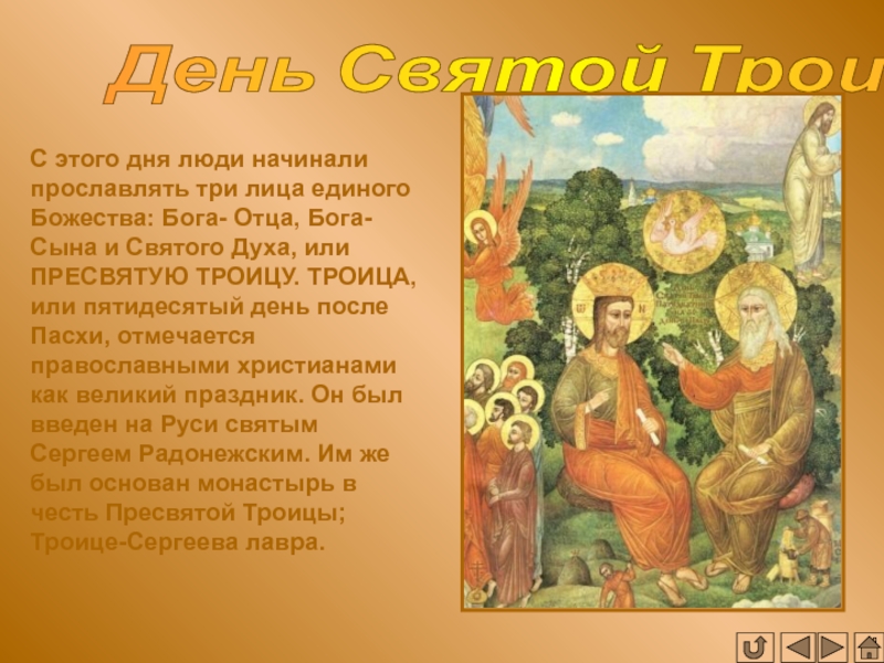ТРОИЦУ. ТРОИЦА, или пятидесятый день после Пасхи, отмечается православными христианами как великий праздник. Он был введен на Руси святым Сергеем Радонежским. Им же был основан монастырь в честь Пресвятой Троицы; Троице-Сергеева лавра.