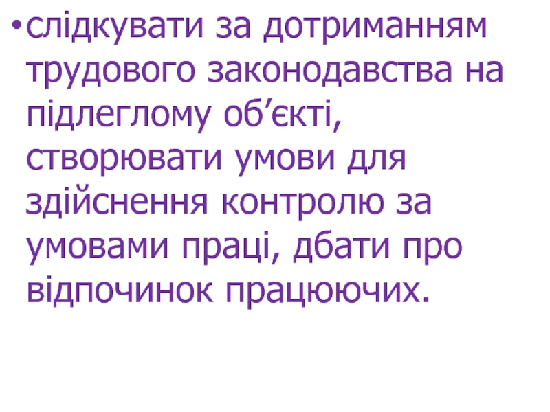 Слайд 71слідкувати за дотриманням трудового законодавства на підлеглому об’єкті, створювати умови