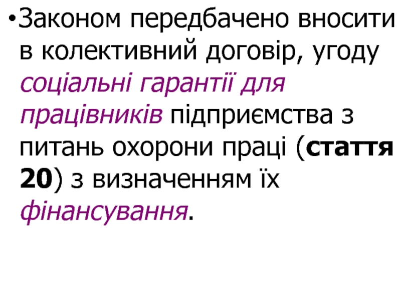 Слайд 24Законом передбачено вносити в колективний договір, угоду соціальні гарантії для
