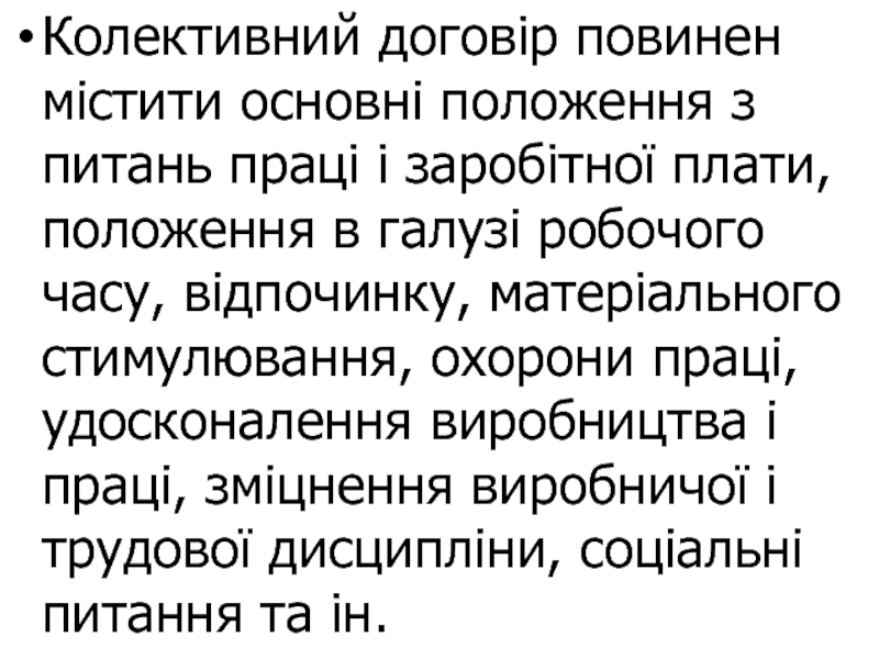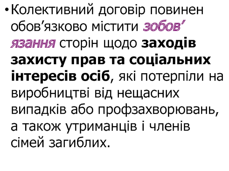 Слайд 59Колективний договір повинен обов’язково містити зобов’язання сторін щодо заходів захисту