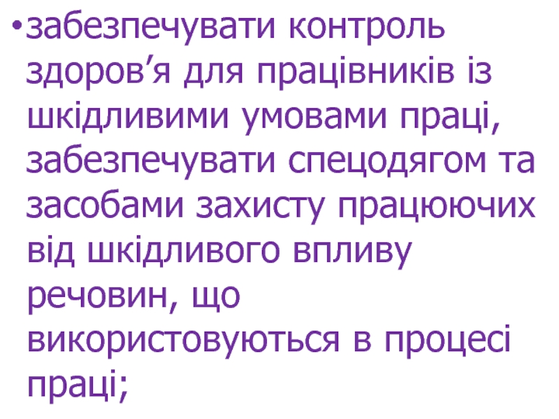 Слайд 70забезпечувати контроль здоров’я для працівників із шкідливими умовами праці, забезпечувати