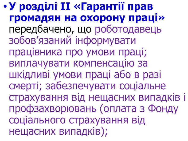 Слайд 10У розділі II «Гарантії прав громадян на охорону праці» передбачено,