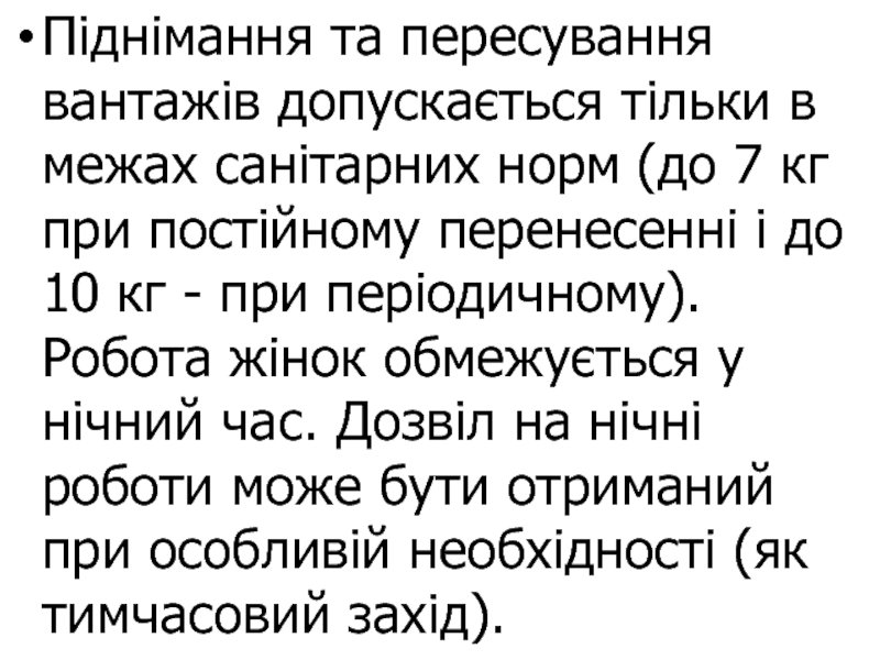 - при періодичному). Робота жінок обмежується у нічний час. Дозвіл на нічні роботи може бути отриманий при особливій необхідності (як тимчасовий захід).