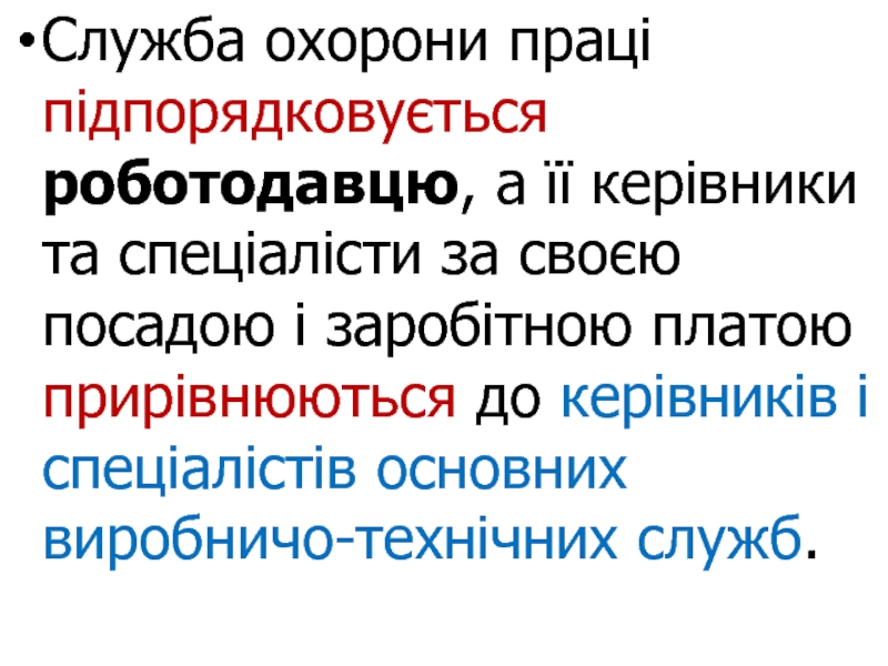 Слайд 16Служба охорони праці підпорядковується роботодавцю, а її керівники та спеціалісти