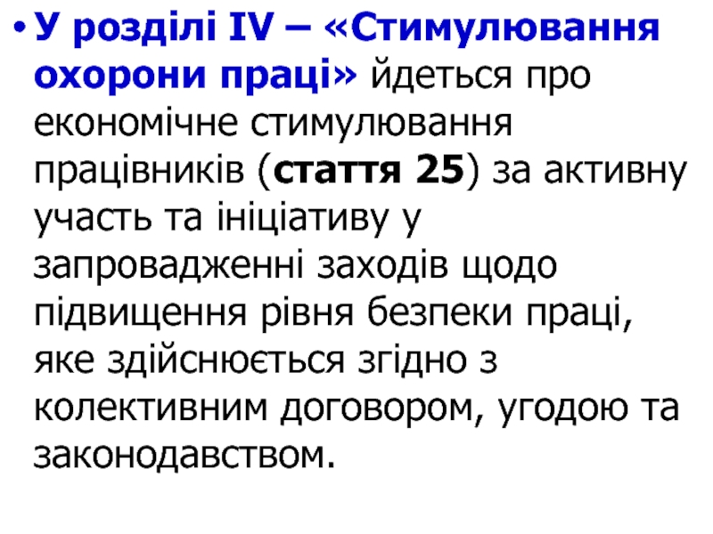 Слайд 29У розділі IV – «Стимулювання охорони праці» йдеться про економічне