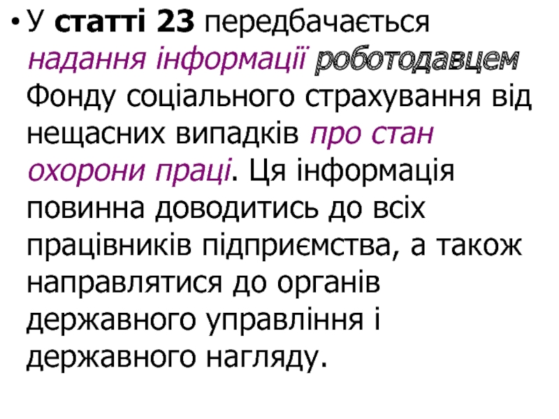 Слайд 27У статті 23 передбачається надання інформації роботодавцем Фонду соціального страхування