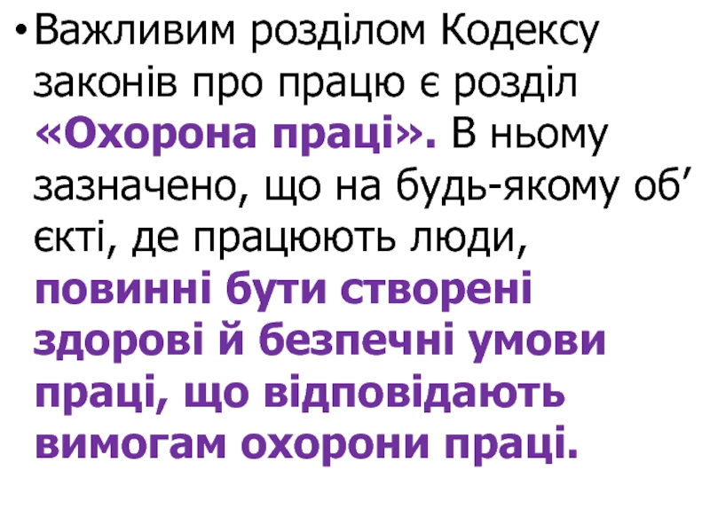 Слайд 67Важливим розділом Кодексу законів про працю є розділ «Охорона праці».