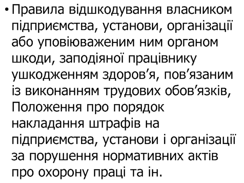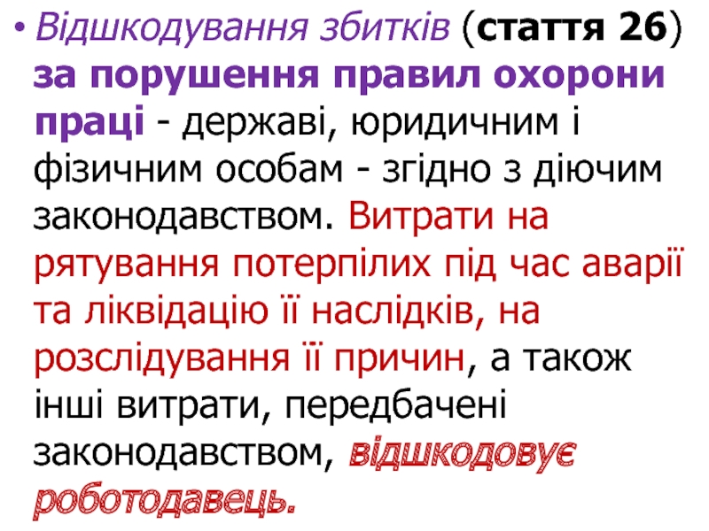 Слайд 30Відшкодування збитків (стаття 26) за порушення правил охорони праці -