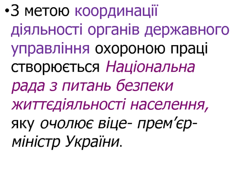 Слайд 34З метою координації діяльності органів державного управління охороною праці створюється