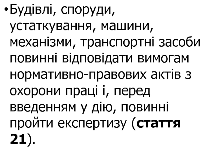 Слайд 25Будівлі, споруди, устаткування, машини, механізми, транспортні засоби повинні відповідати вимогам