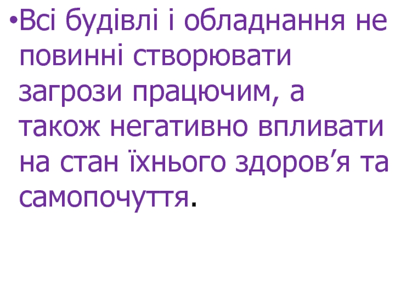 Слайд 68Всі будівлі і обладнання не повинні створювати загрози працючим, а