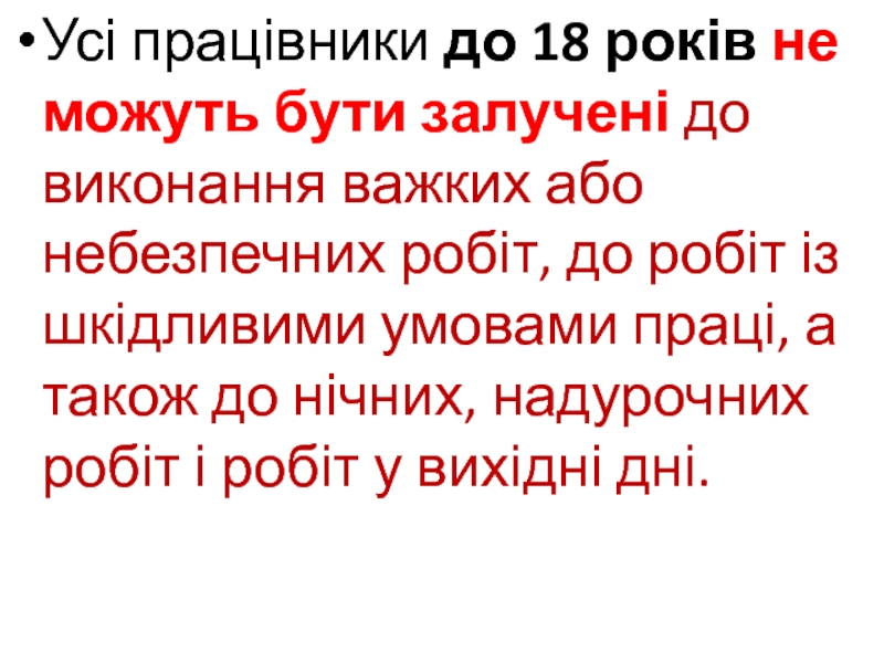 Слайд 83Усі працівники до 18 років не можуть бути залучені до