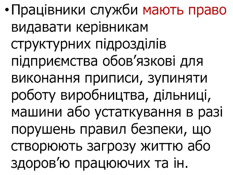 Слайд 17Працівники служби мають право видавати керівникам структурних підрозділів підприємства обов’язкові