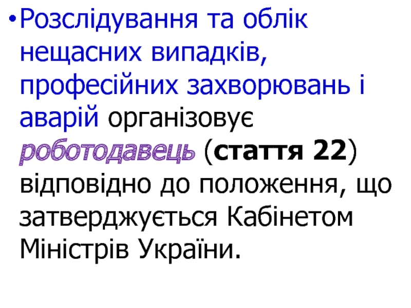 Слайд 26Розслідування та облік нещасних випадків, професійних захворювань і аварій організовує