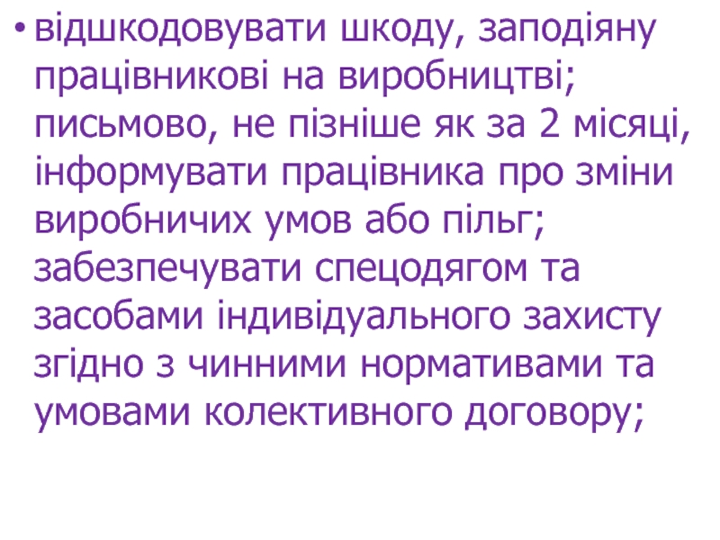 Слайд 11відшкодовувати шкоду, заподіяну працівникові на виробництві; письмово, не пізніше як