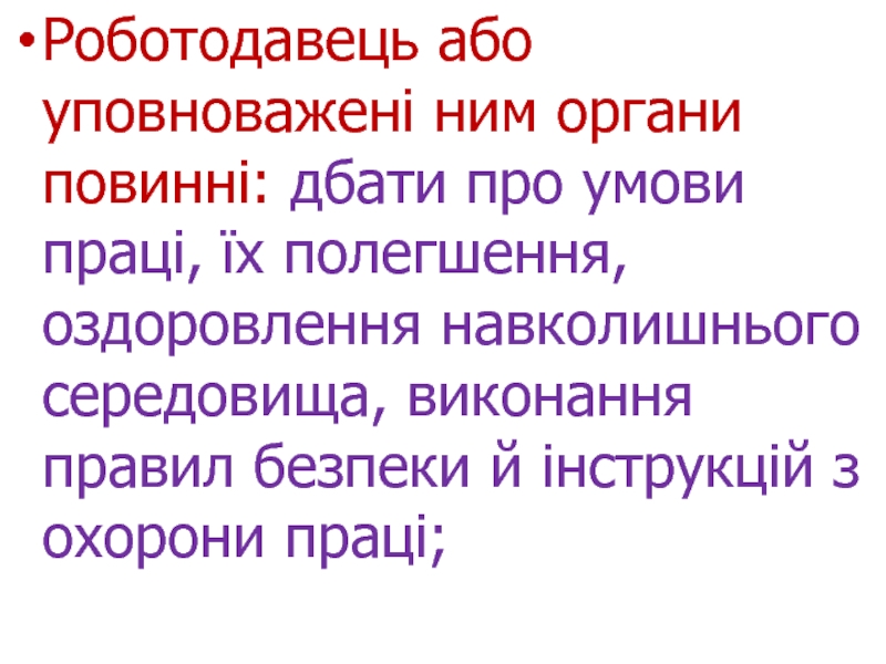 Слайд 69Роботодавець або уповноважені ним органи повинні: дбати про умови праці,