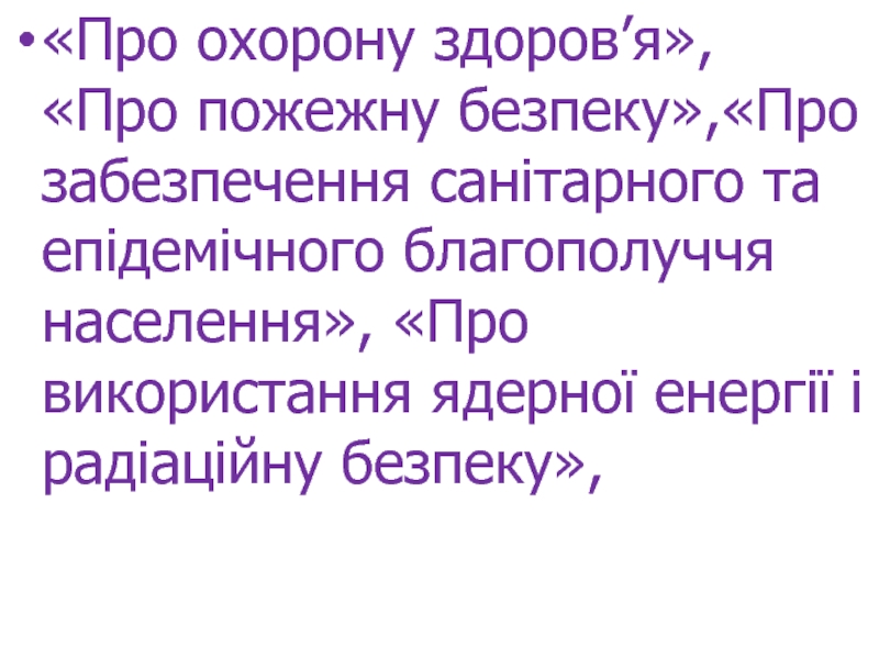 Слайд 4«Про охорону здоров’я», «Про пожежну безпеку»,«Про забезпечення санітарного та епідемічного