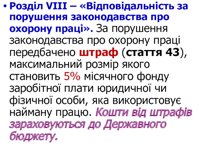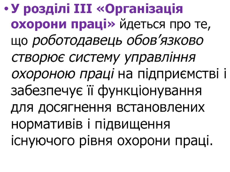 Слайд 13У розділі III «Організація охорони праці» йдеться про те, що