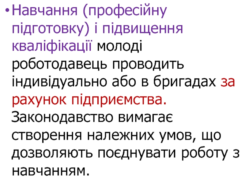 Слайд 85Навчання (професійну підготовку) і підвищення кваліфікації молоді роботодавець проводить індивідуально