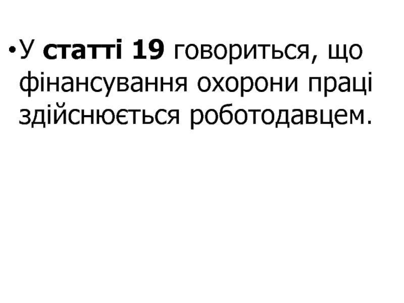 Слайд 21У статті 19 говориться, що фінансування охорони праці здійснюється роботодавцем.