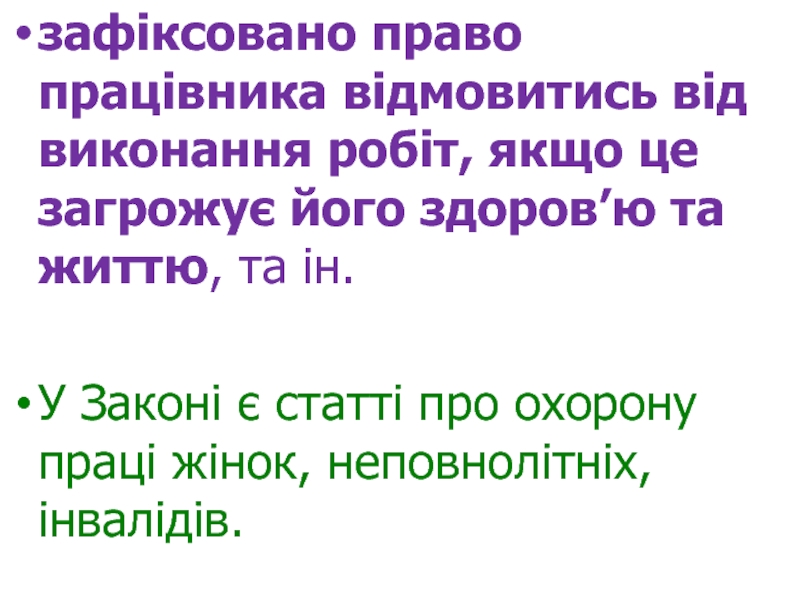 Слайд 12зафіксовано право працівника відмовитись від виконання робіт, якщо це загрожує