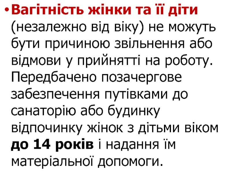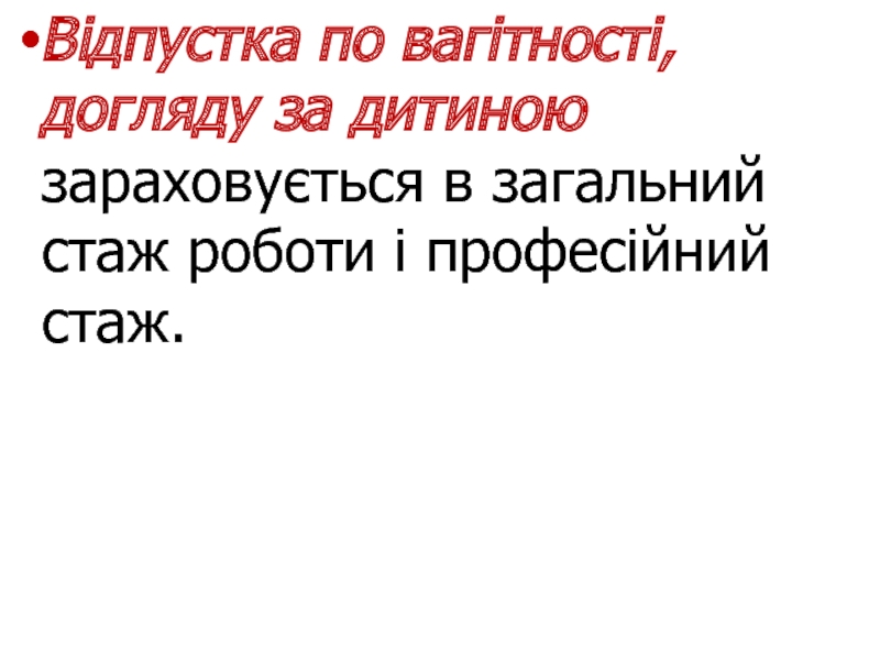 Слайд 77Відпустка по вагітності, догляду за дитиною зараховується в загальний стаж