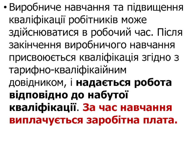 Слайд 86Виробниче навчання та підвищення кваліфікації робітників може здійснюватися в робочий