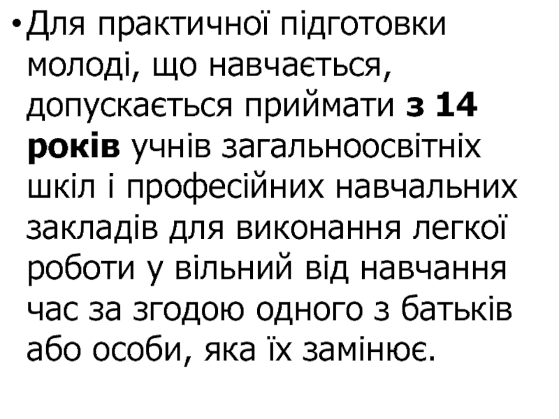 Слайд 81Для практичної підготовки молоді, що навчається, допускається приймати з 14