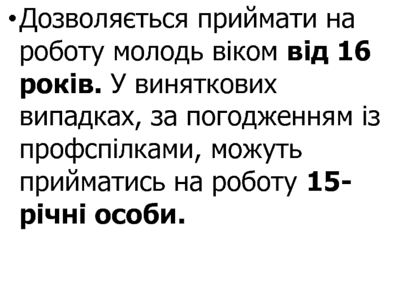 Слайд 80Дозволяється приймати на роботу молодь віком від 16 років. У