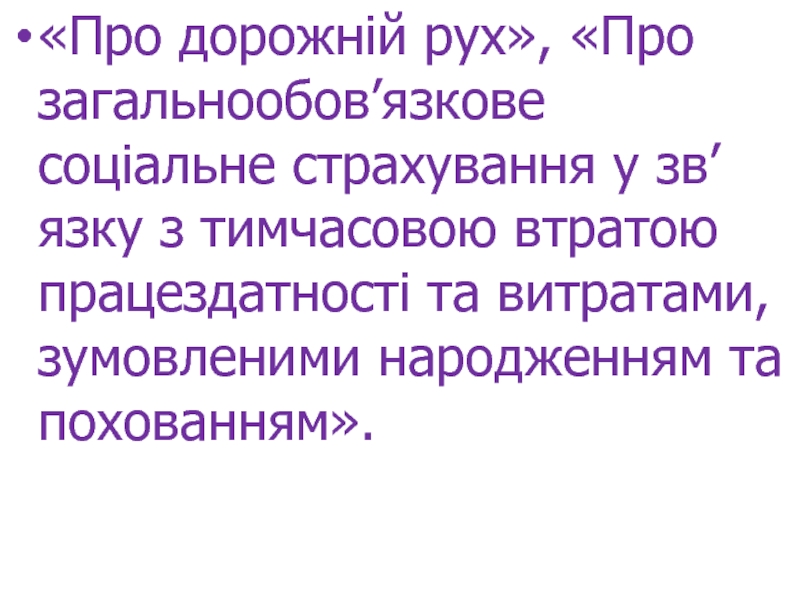Слайд 5«Про дорожній рух», «Про загальнообов’язкове соціальне страхування у зв’язку з