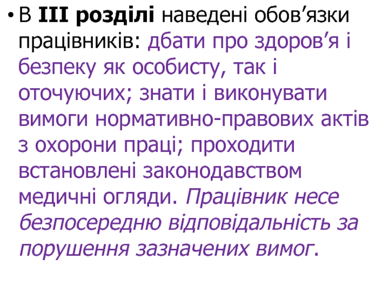 Слайд 14В ІІІ розділі наведені обов’язки працівників: дбати про здоров’я і
