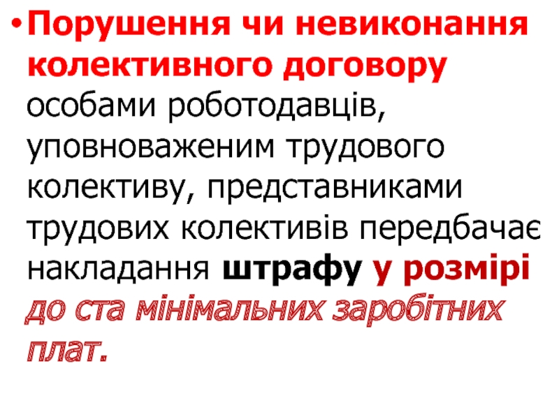 Слайд 63Порушення чи невиконання колективного договору особами роботодавців, уповноваженим трудового колективу,