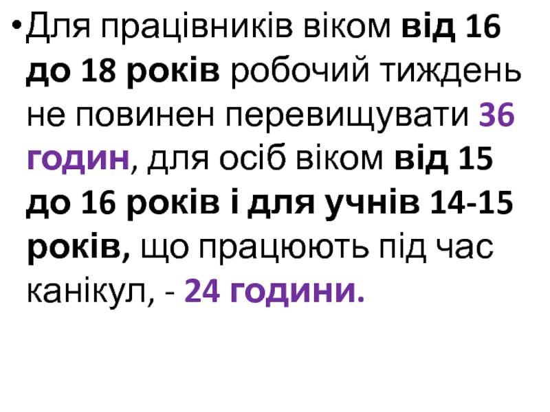 Слайд 84Для працівників віком від 16 до 18 років робочий тиждень
