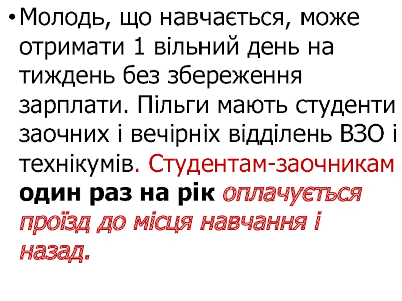 Слайд 88Молодь, що навчається, може отримати 1 вільний день на тиждень