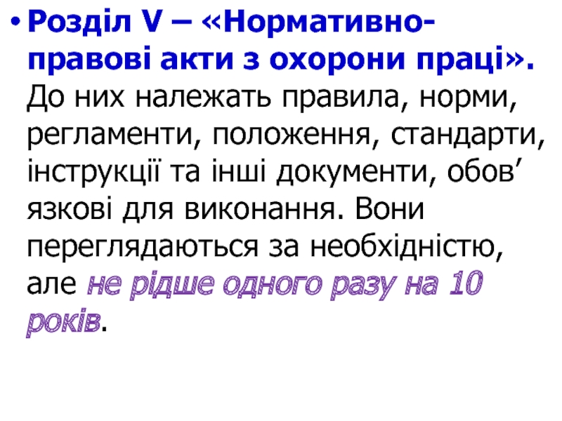 Слайд 31Розділ V – «Нормативно-правові акти з охорони праці». До них