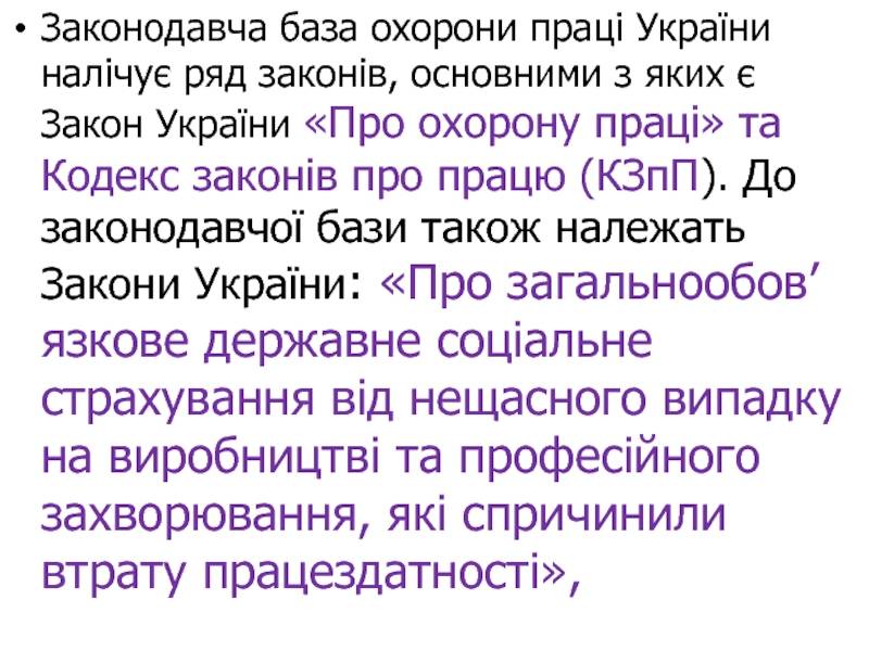 про працю (КЗпП). До законодавчої бази також належать Закони України: «Про загальнообов’язкове державне соціальне страхування від нещасного випадку на виробництві та професійного захворювання, які спричинили втрату працездатності»,