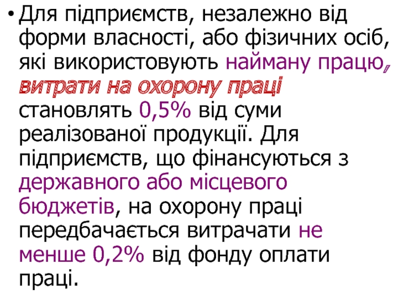 суми реалізованої продукції. Для підприємств, що фінансуються з державного або місцевого бюджетів, на охорону праці передбачається витрачати не менше 0,2% від фонду оплати праці.