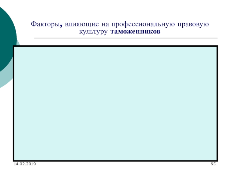 Слайд 65Факторы, влияющие на профессиональную правовую культуру таможенников