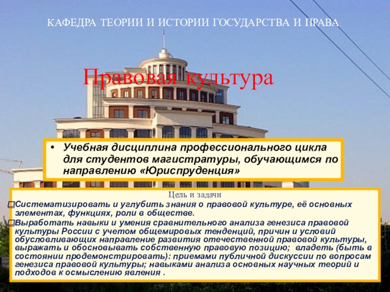 Выработать навыки и умения сравнительного анализа генезиса правовой культуры России с учетом общемировых тенденций, причин и условий обусловливающих направление развития отечественной правовой культуры, выражать и обосновывать собственную правовую позицию; владеть (быть в состоянии продемонстрировать): приемами публичной дискуссии по вопросам генезиса правовой культуры; навыками анализа основных научных теорий и подходов к осмыслению явления .