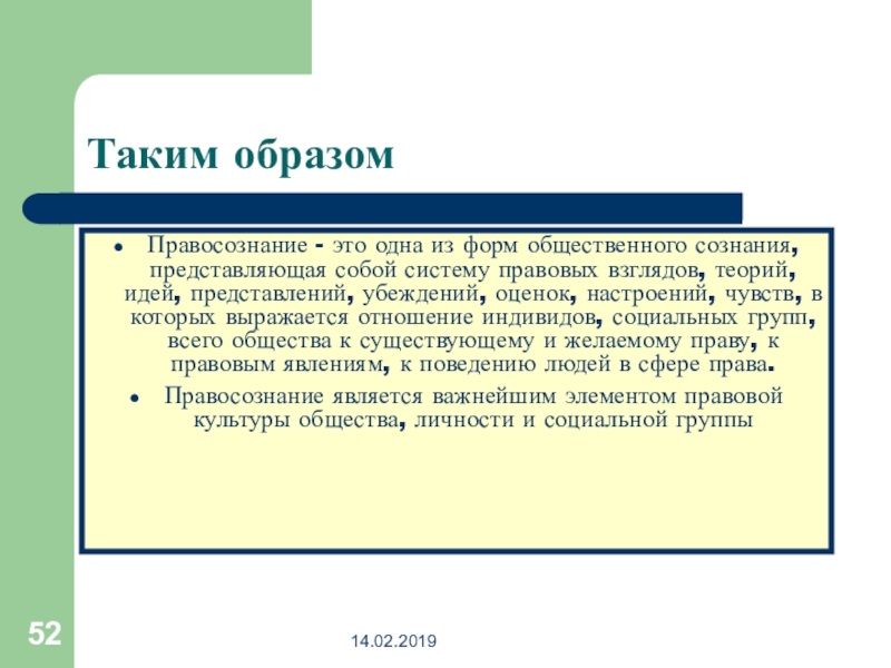 Правосознание представляет собой систему правовых взглядов, теорий, идей, представлений, убеждений, оценок, настроений, чувств, в которых выражается отношение индивидов, социальных групп, всего общества к существующему и желаемому праву, к правовым явлениям, к поведению людей в сфере права.