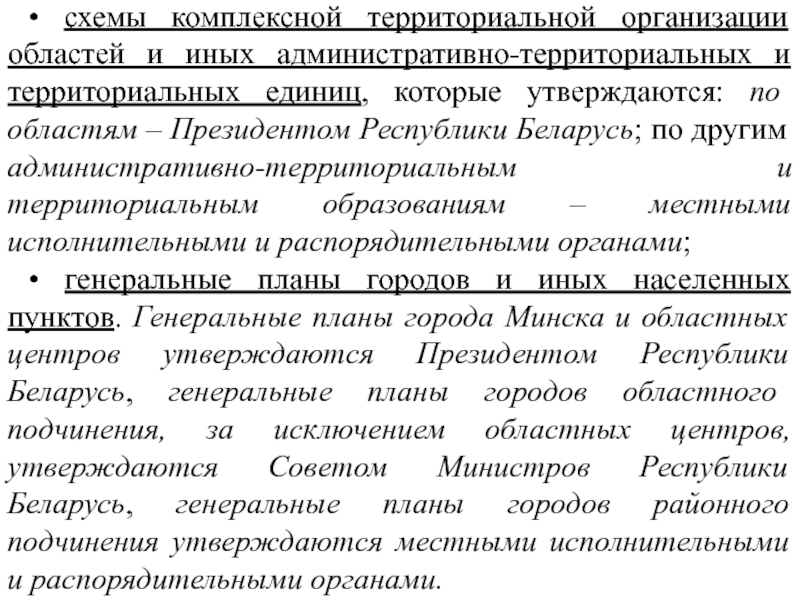 • генеральные планы городов и иных населенных пунктов. Генеральные планы города Минска и областных центров утверждаются Президентом Республики Беларусь, генеральные планы городов областного подчинения, за исключением областных центров, утверждаются Советом Министров Республики Беларусь, генеральные планы городов районного подчинения утверждаются местными исполнительными и распорядительными органами.